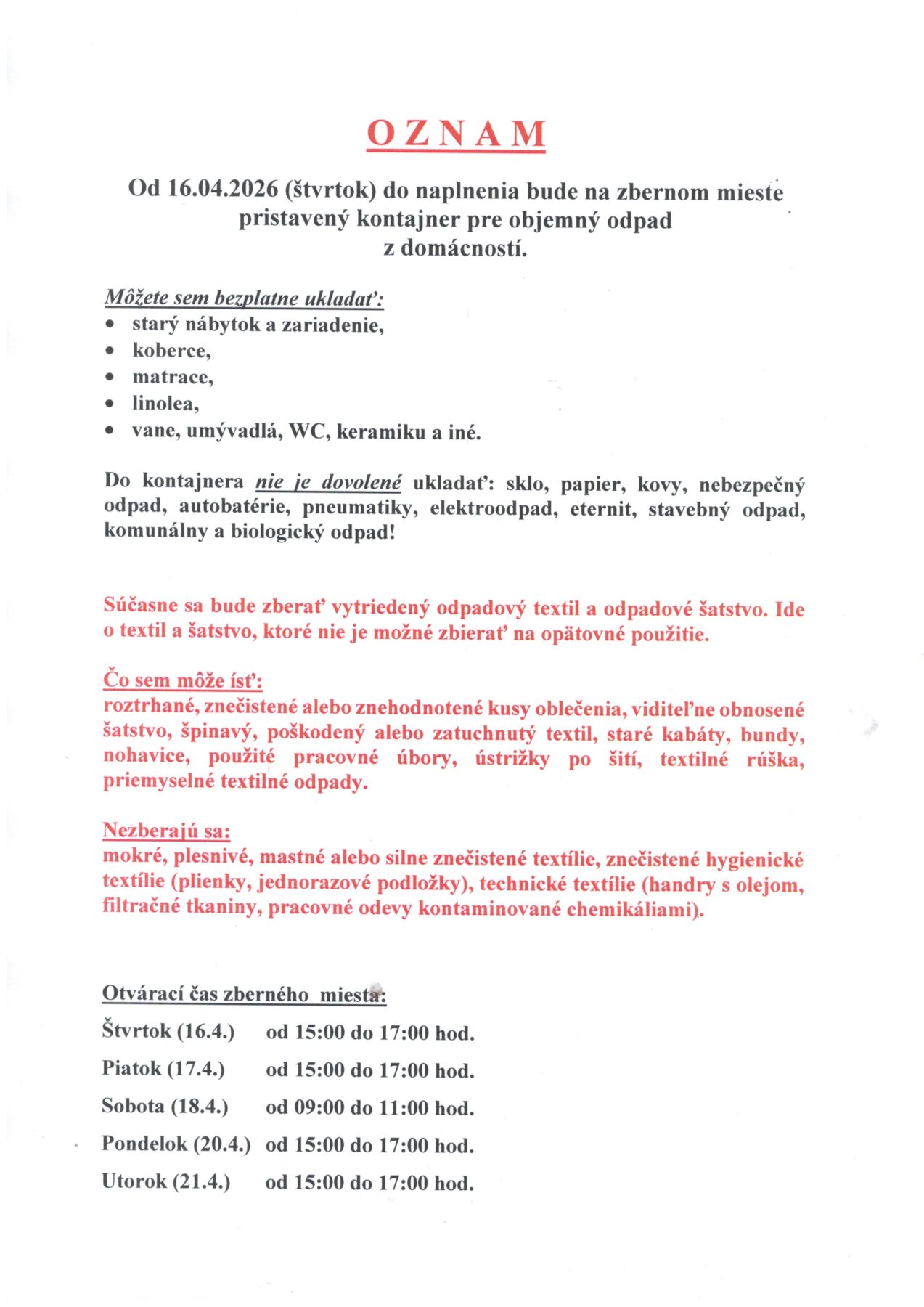 Od 16.04.2026 (štvrtok) do naplnenia bude na zbernom mieste pristavený kontajner pre objemný odpad z domácností.